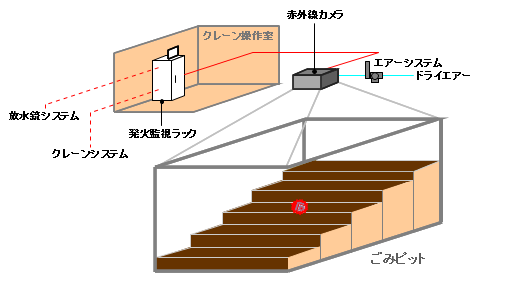 清掃工場のごみピット・バンカで発生する発火を初期段階で検知するために開発した赤外線式監視装置です。